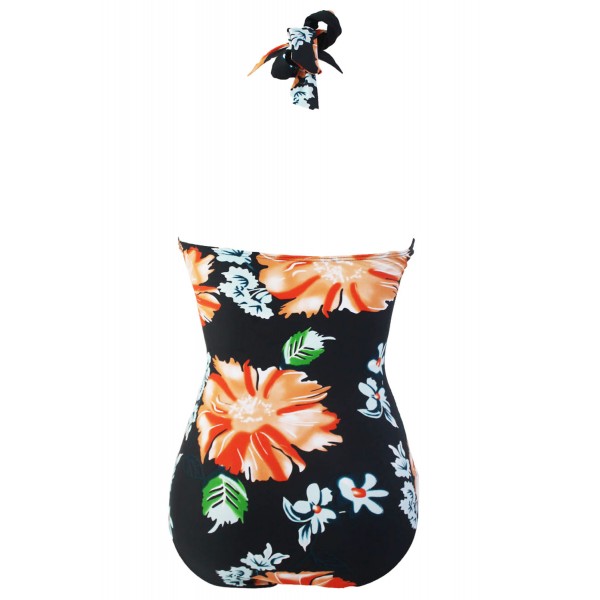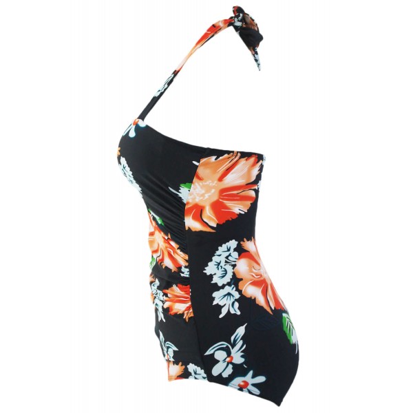Maillot de bain femme 1 pièce monkini pin up noir et motif floral effet drapé avec soutien-gorge rembourré.