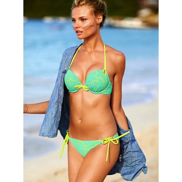 Maillot de bain effet push up vert recouvert de fine dentelle bleue pour un été acidulé.