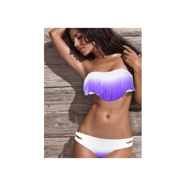 Maillot de bain 2 pièces blanc et violet, soutien-gorge forme bandeau à franges avec rembourrage amovible.