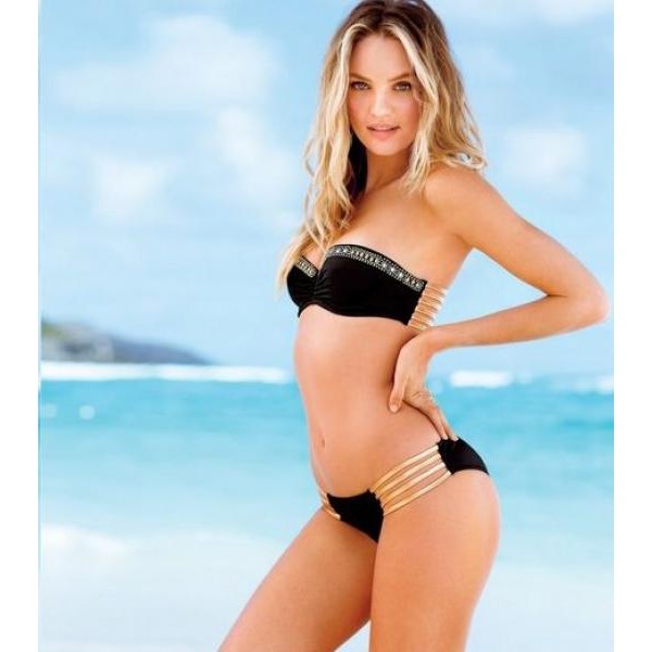 Maillot de bain noir avec ses multiples lacets dorés.