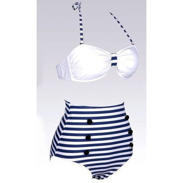 Maillot de bain à rayure bleu et blanc style rétro avec culotte montante.