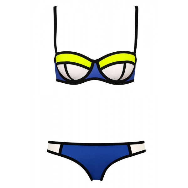 Sublime maillot de bain forme corbeille bleu, blanc et jaune.