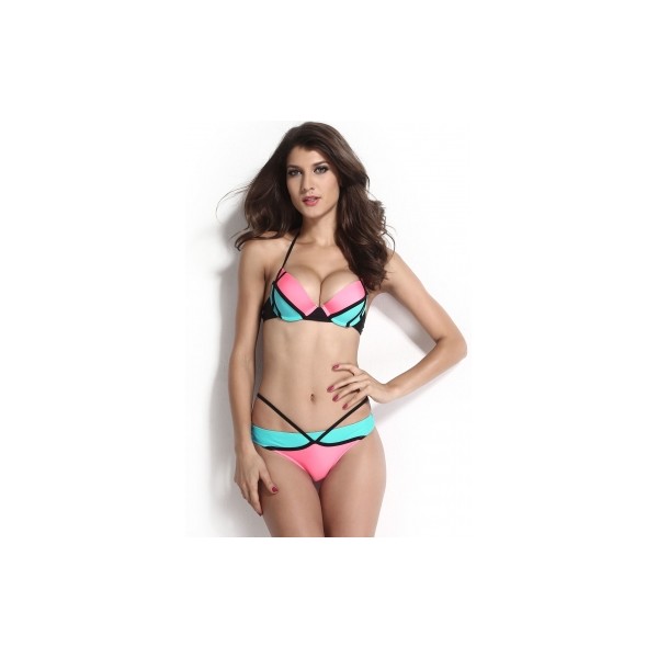 Sublime maillot de bain forme corbeille rose, bleu et lien noir.