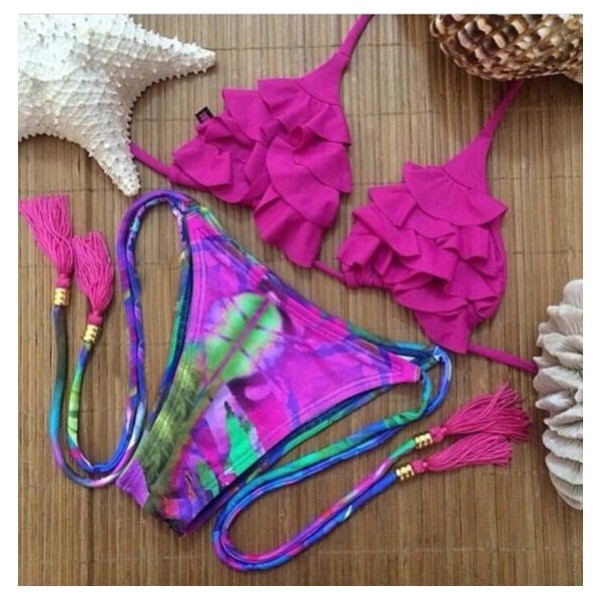 Maillot de bain 2 pièces soutien-gorge forme triangle coulissant rose avec volants frou-frou.