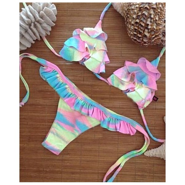 Maillot de bain 2 pièces soutien-gorge forme triangle coulissant multicolore avec volants frou-frou.