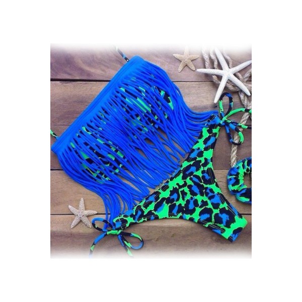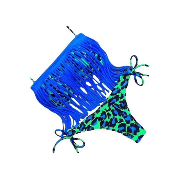 Maillot de bain 2 pièces léopard vert, et bleu soutien-gorge forme bandeau à franges longues.