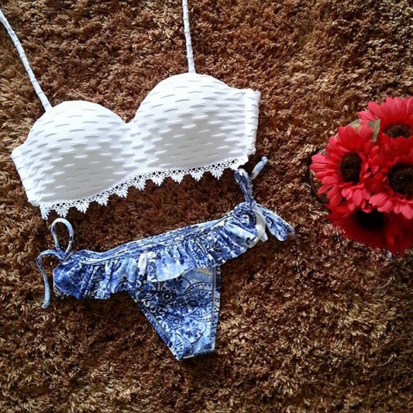 Maillot de bain 2 pièces soutien-gorge blanc et culotte bleue.
