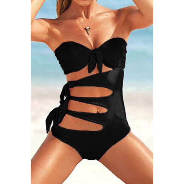 Sublime maillot de bain trikini noir effet sauvage avec le liens à nouer sur les côtés.